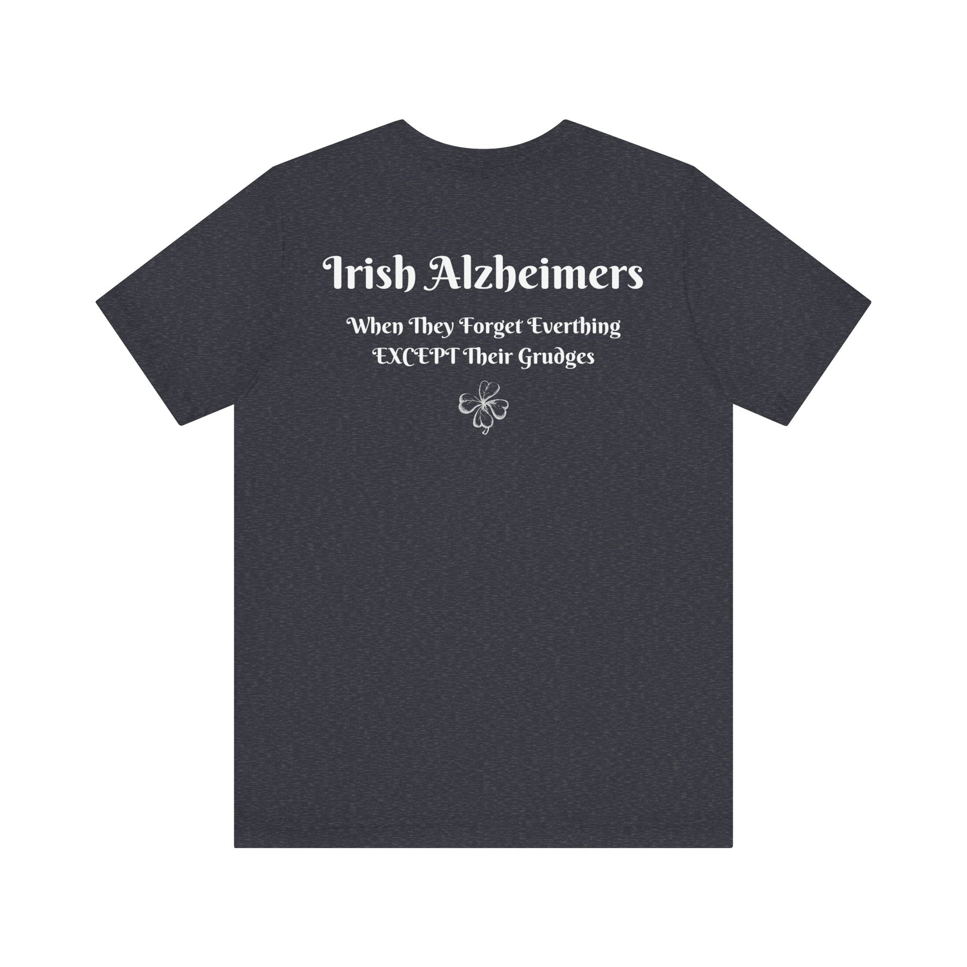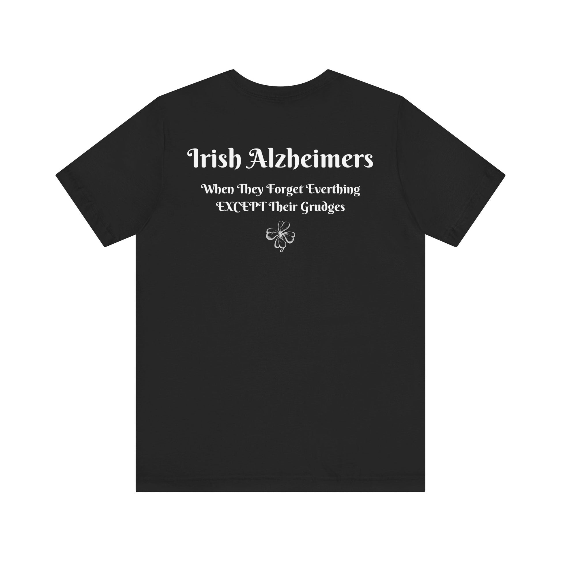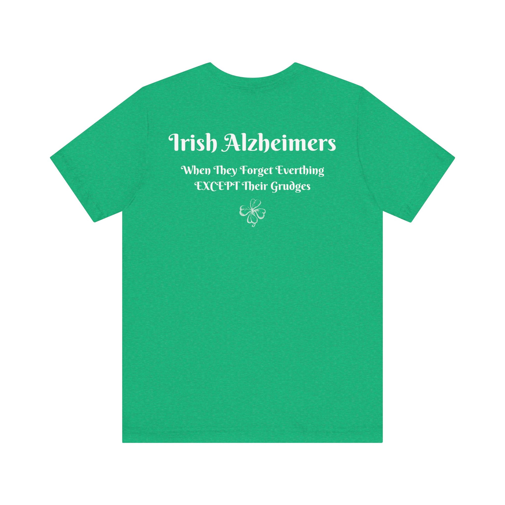 Irish Alzheimers | Lucky | 4 Leaf Clover | Shamrock | Funny | Humor | Design On Back | Mens Womens Unisex Jersey Short Sleeve Tee